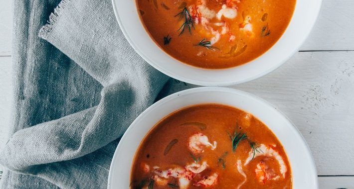De soep krijgt zijn mooie rode kleurtje van tomatenpuree. En een extra anijsachtige smaak door de venkel en het venkelzaad. Je kunt verder lekker over de top gaan met een topping met allerlei zeevruchten, zeekraal of een mooie grote garnaal. Ik koos voor rivierkreeftjes en wat dille. Wat ook een leuk idee is om de soep in kleine glaasjes te serveren, als een soort van hapje.