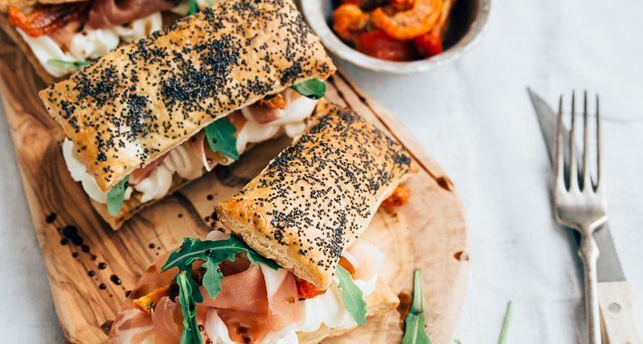 Het voordeel van dit recept is dat je het ook heel gemakkelijk vega kunt maken. Dan laat je de prosciutto gewoon achterwege. Je kunt het ook gemakkelijk voorbereiden. Je kan de bladerdeegplakjes alvast afbakken en de geitenkaasmousse kan je ook van tevoren maken. Dan hoef je de tompouce alleen nog in elkaar te zetten als je gasten er zijn. En dat is binnen 10 minuten gedaan. Je zou ook een variatie kunnen maken met gerookte zalm en geitenkaas, of blauwe kaas en vijgen. Dat is nou het leuke aan koken. Geef er vooral zelf je eigen draai aan.