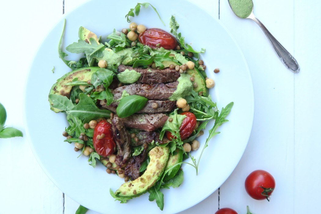 Gister maakte ik samen met twee vriendinnen deze gezonde en super lekkerekikkererwten salade met rucola, gebakken avocado en biefstukreepjes klaar als avondeten. Af en toe hoor ik nog wel eens dat salades niet vullen. “Ik zou graag wat minder brood willen eten en meer groen maar na het eten van een salade heb ik na twee uur al weer honger”. Nouuu dat gaat bij deze kanjer niet op! De linzen en kikkererwten geven je namelijk een langdurig verzadigd gevoel. Lekker met gepofte balsamico tomaatjes uit de oven. Oh, en gebakken avocado! Moet je geprobeerd hebben want dit is echt onwijs lekker.