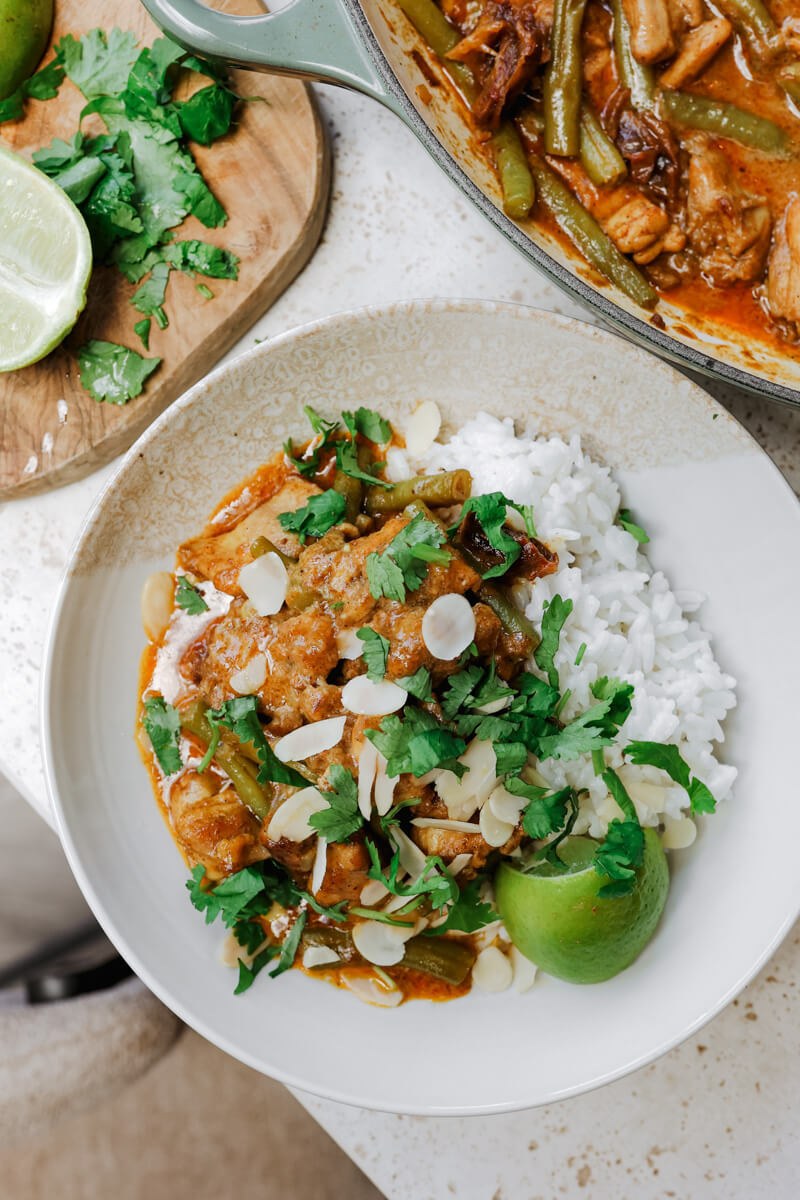 Er zijn tientallen kip kerrie variaties te vinden. Mijn versie is lekker eenvoudig, met een kort ingrediëntenlijstje, maar wél met veel smaak. Naast kerriepoeder gaat er verse gember doorheen, zachte dadels én een snufje Chinees vijfkruidenpoeder. Die laatste kun je eventueel weglaten, maar hij geeft het gerecht net even wat extra diepgang. Zó lekker. En verder? Gewoon lekker oldskool met boontjes en rijst. Ik kook de rijst graag met een flinke scheut kokosmelk, daar wordt hij heerlijk romig van. Echt een aanrader!