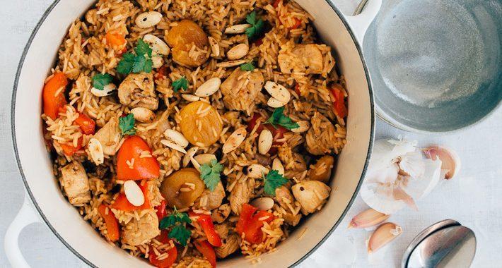 Lekker is deze kip pilav zeker! Je kookt de rijst met alle smaakmakers in de bouillon gaar. Pilav rijst komt uit het Midden Oosten (al las ik ook dat het van origine Turks is) dus die smaken heb ik ook gebruikt. Het bereiden lijkt een beetje op risotto. Alleen nu voeg je alle bouillon in een keer toe. Lekker met de warme kruiden. Verder voegde ik paprika toe, je zou eventueel ook een courgette en wortel mee kunnen bakken voor wat extra groente. De zoete abrikozen maken het helemaal af. Ik ben benieuwd wat je er van vindt, laat het vooral weten als je het gemaakt hebt.