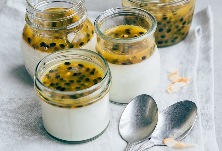 Kan je geen passievrucht vinden, kijk dan even in het vriesvak in de supermarkt. Daar hebben ze tegenwoordig blokjes ingevroren passievrucht staan. Ideaal. Wel zou ik er dan na het verwarmen een klein beetje gelatine aan toevoegen, zodat het mooi bindt. Dat hoeft met verse passievrucht niet, maar deze uit de vriezer wordt toch wat wateriger. En met deze kokos pannacotta sluit je het menu heerlijk licht en fris af. En dat vind ik zelf wel fijn, want rollend van tafel hoeft van mij niet. Laat je het even weten als je het gemaakt hebt.