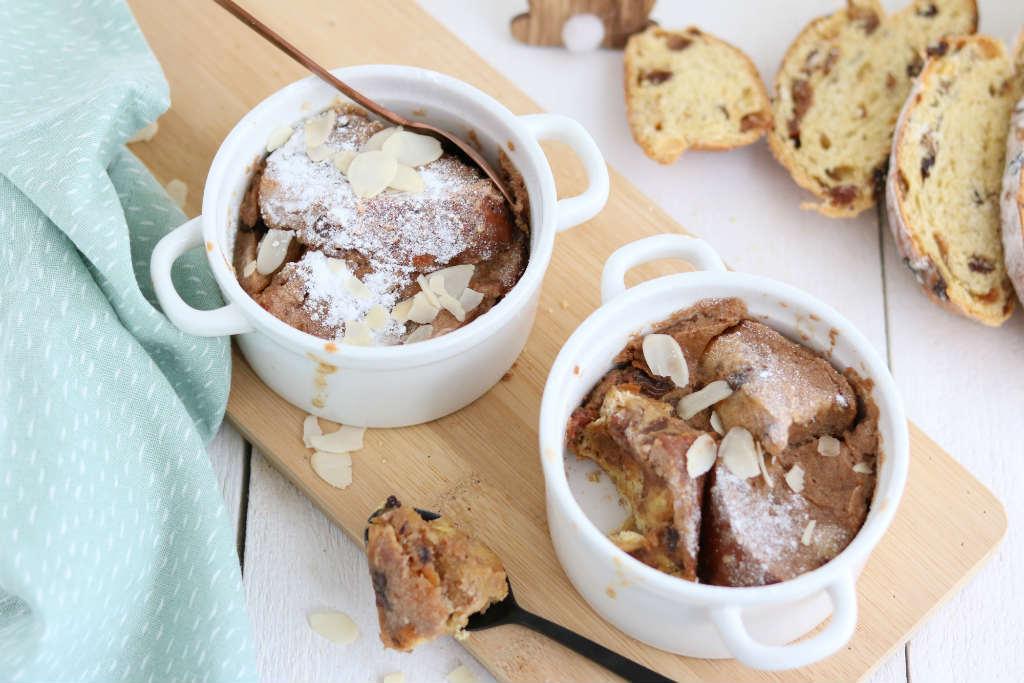 Laat mij eens raden. Staat er krentenbrood bij jullie op tafel vandaag? Hebben jullie dit brood wel eens over? Ik heb hier nooit last van. Bij ons is het brood altijd schoon op of een paar plakken worden ingevroren. Maar goed. Stel nou eens dat je het niet op krijgt en de paasstol zelfs oud word. Hartstikke zonde natuurlijk om dit weg te gooien. Ik heb hier nog een hele fijne bestemming voor: krentenbrood pudding uit de oven.