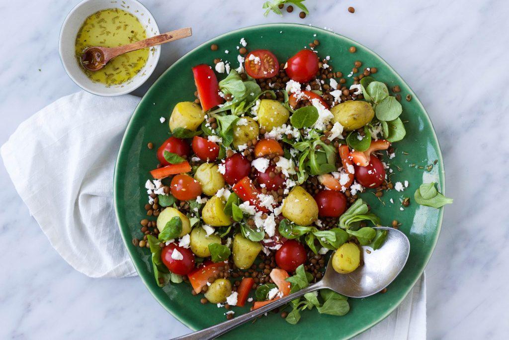 De salade vult goed door de aardappel en linzen en zit vol met eiwitten. De rozemarijn vinaigrette is een heerlijke smaakmaker, laat deze dus niet weg!