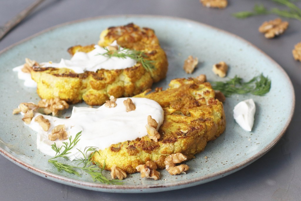 Wat moet je je daarbij voorstellen, steak van bloemkool? Heel simpel. Een dikke plak kruidig geroosterde bloemkool uit de oven met een heerlijk sausje van geitenkaas. Perfect als vleesvervanger en lekker met gebakken aardappeltjes en gestoomde groenten erbij.
