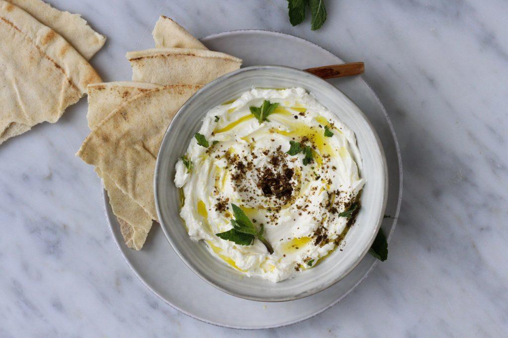 Labneh is een romige yoghurtdip die veel wordt gegeten als hartig bijgerecht in Libanon. Deze dip wordt meestal geserveerd met Libanees brood. Labneh is eigenlijk gewoon Griekse of Turkse yoghurt die je een paar uur laat uitlekken, waardoor er een dikke yoghurt/hangop bestaan. Vervolgens voeg je toppings toe als granaatappelpitjes, pistachenoten, munt of een van mijn favoriete kruiden dit moment: za’atar!