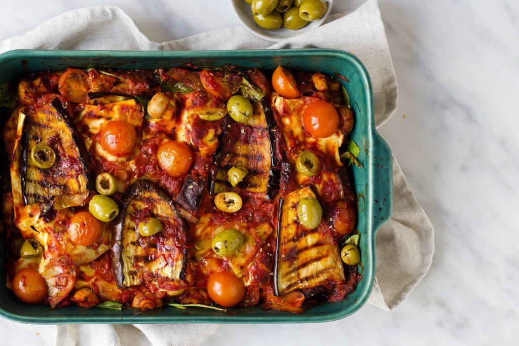 Lasagne met gegrilde aubergine, artisjok en olijven