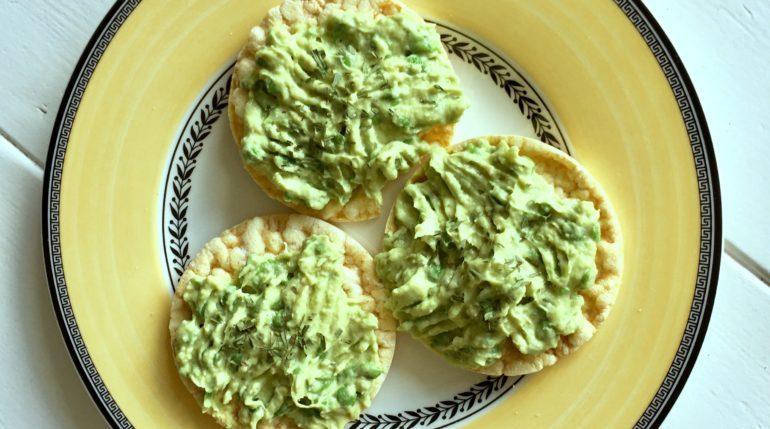 In dit geval gaan we voor een lekker frisse velderwten mole. Gemaakt van avocado, jonge velderwten, magere yoghurt, tabasco, gedroogde dragon en limoensap. De erwten, dragon en limoen zorgen voor een frisse smaak. De tabasco geeft het een beetje extra pit. Heerlijk op een rijstcracker én low calorie. Wat wil je nog meer.