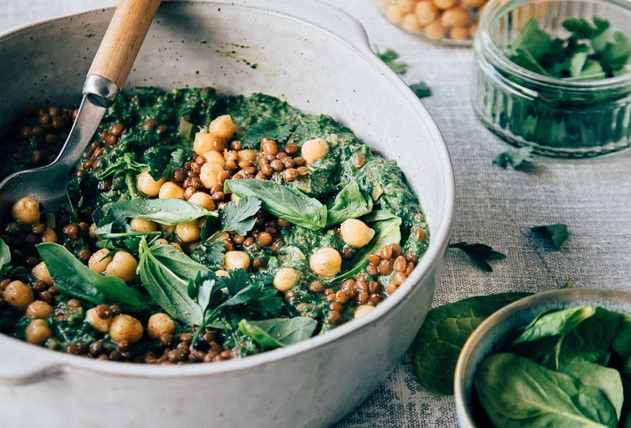 Je maakt dit stoofgerecht door het groene spinazie gedeelte apart te maken van het stoven van de linzen. Hierdoor behoudt de stoofschotel een mooie groene kleur en een lekkere smaak. Wanneer je spinazie te lang kookt wordt de smaak wrang en bitter. De spinazie laat je dus eerst slinken in een pan. Dan doe je de spinazie met verse kruiden in een blender en hakt het totdat er een mooie gladde puree ontstaat. Aan het einde roer je er wat tahini doorheen wat het gerecht een lekkere nootachtige romige smaak geeft.
