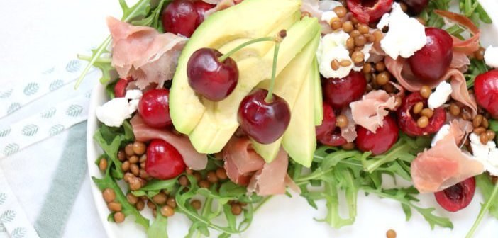 Ooh, ik word zo blij van deze zomerse dagen! Wat een feestje! Al een paar weken gewoon bijna elke dag mooi weer… Ik hoop echt dat dit een voorbode gaat zijn van een heerlijke lange zwoele zomer. Daar waar ik zei dat ik elk seizoen wel wat vind hebben, bedoelde ik natuurlijk áls het zonnetje maar schijnt. De zon doet wat met me, ik word er vrolijker van en wil vooral lekker veel buiten zijn. En ik krijg weer volop inspiratie voor frisse salades, om in de tuin – lees nog bouwplaats… – op te eten. Zo ook deze linzensalade met geitenkaas en kersen. En ja, kersen in een salade zijn echt heerlijk, moet je eens proberen!