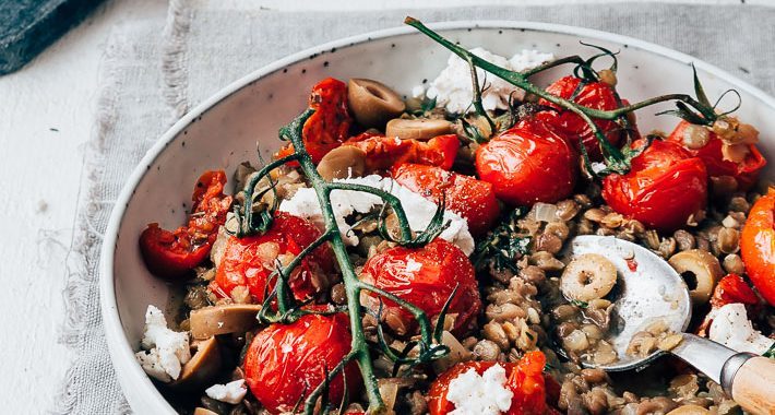 Ingrediƫnten voor 4 personen 125 gr groene (gedroogde) linzen 1 ui, fijngesneden 2 tenen knoflook, fijngesneden 500 ml groentebouillon 4 takjes trostomaten 10 semi gedroogde tomaatjes 10 groene olijven (zonder pit), gehalveerd 150 gr verse geitenkaas 4 takjes verse tijm Peper en zout naar smaak 2 el olijfolie Eventueel: boerenbrood voor erbij