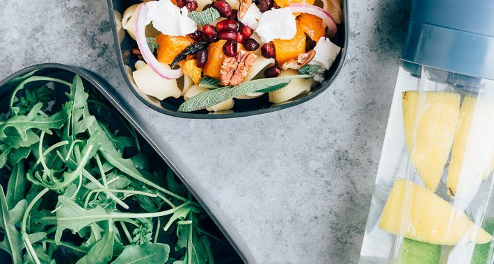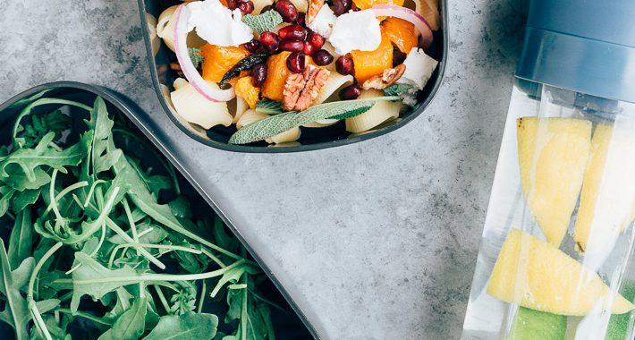 Het oog wil ook wat, met deze bento box kan je prima aankomen op kantoor. Hij ziet er super hip en stijlvol uit! Dus naast praktisch ook gewoon heel mooi. En daar houden wij van, we zijn dol op mooie spullen. Dat geldt overigens voor het hele BergHOFF To Go assortiment. De waterfles (en ook de thermofles) is ook al zo mooi. In ieder geval blijft deze pastasalade met pompoen er lekker vers in. En als je wilt kan je de pasta dus ook kort verwarmen, extra lekker op een koude dag.