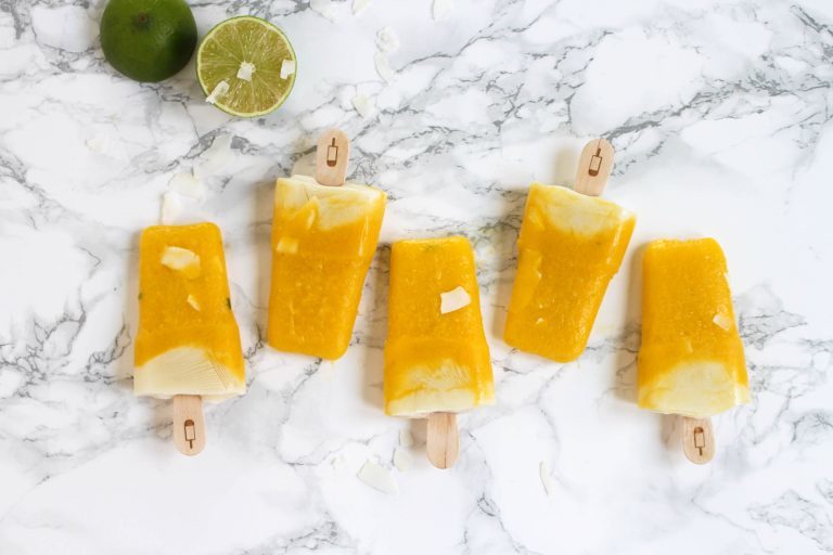Ik maakte deze ijsjes met verse mango (is voor deze ijsjes toch echt wel lekkerder dan uit de diepvries). limoensap, eens scheutje kokos-rijstmelk en nog wat kokossnippers. Je kunt ook alleen water en kokossnippers gebruiken. Of alleen water en kokos-rijstmelk en geen kokossnippers. Maar net wat je lekker vindt en in huis hebt.