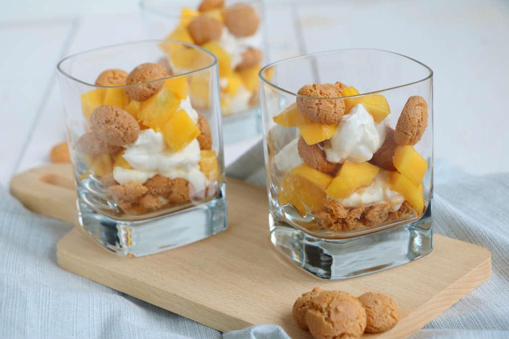 Je kunt dit dessert zelfs maken terwijl de gasten aan tafel zitten. Het is een kwestie van fruit in stukjes snijden. De mango, yoghurt, mascarpone, suiker en citroensap mengen en vervolgens in lagen opbouwen. Het hoeft allemaal ook niet te netjes. Binnen 5 minuutjes staat dit dessert op tafel!