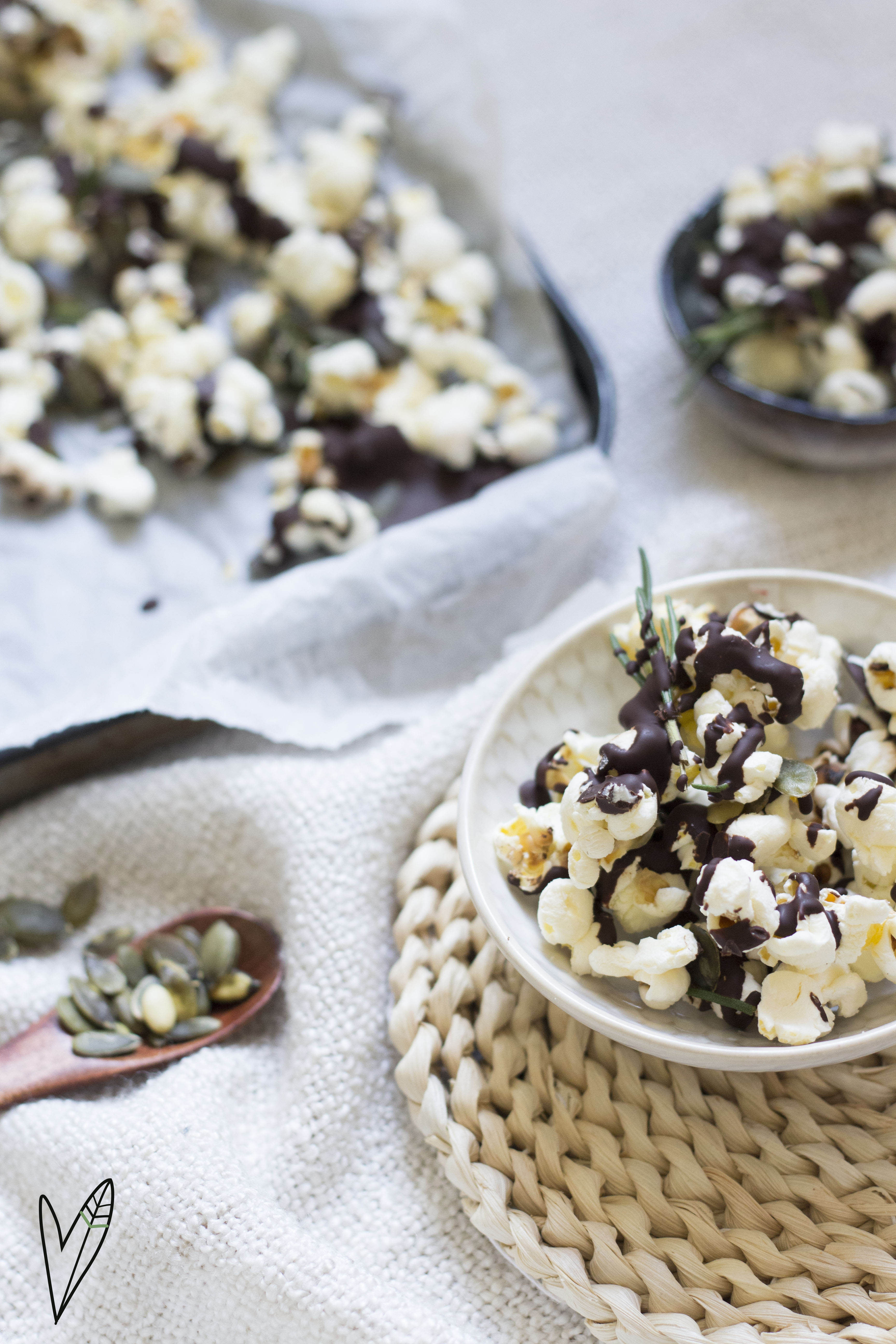 Wat is een filmavond nou zonder popcorn? Of je nou Pretty Woman (een van de favorieten van Tessa) of The DaVinci Code kijkt, een snack zo tussendoor is wel lekker. Wil je een keer iets anders dan alleen de keuze tussen zoet of zout? Dan hebben wij een heerlijk receptje bedacht. Namelijk popcorn met chocola en rozemarijn! Maak dit voordat de film begint en verdeel het daarna in gezellige bakjes. Lees gauw verder voor de bereidingswijze en de handige foto's daarbij.