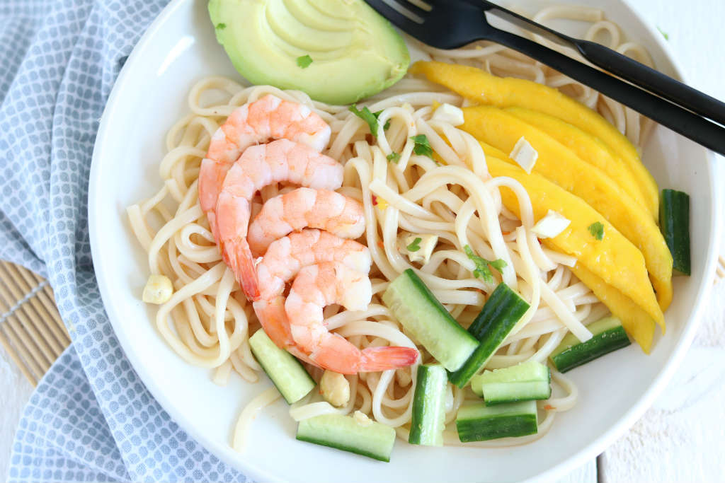 Hebben jullie vandaag ook een dagje vrij genomen na Hemelvaart? Manlief en ik hadden allerlei wilde plannen om ons kantoor te verven. Totdat wij het weerbericht lazen…. Dat schilderen doen we nog wel een keertje. Voor nu gaan wij genieten van het mooie weer. De tuin zag groen van het onkruid dus wij hebben ons gisteren al nuttig gemaakt. Vanavond eten wij lekker in de tuin en voor jullie staat de noedelsalade met mango en garnalen klaar.