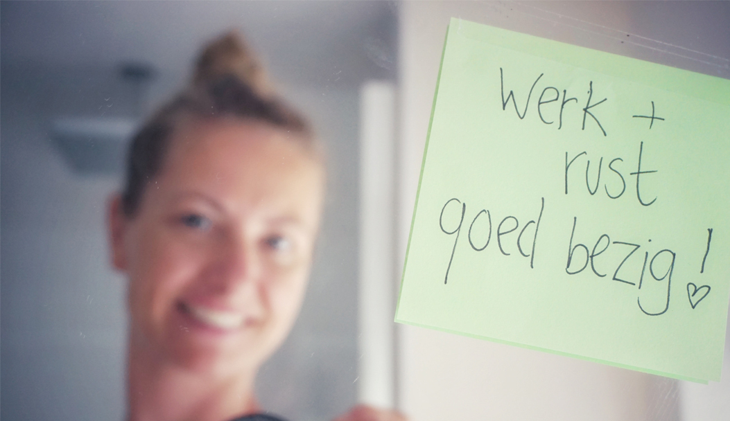 Ik ben net, na drie jaar reizen, begonnen met werken en sta de hele dag, ben aan het schoonmaken en ik krijg allemaal nieuwe indrukken. Ik ben dus ontzettend moe. Maar ik wil in de avond eigenlijk nog mijn sociale leven en sport hebben, wat nu natuurlijk niet lukt. Daarbij heb ik ook nog allemaal vrijwilligersdingen lopen, waar ik ja tegen heb gezegd toen ik nog niet werkte. Dat krijg ik nu bijna niet meer voor elkaar. Een fantastische mix om gestrest, teleurgesteld in mezelf en terneergeslagen te raken.