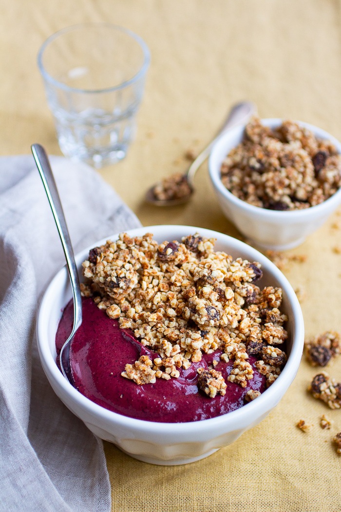 Op de foto at ik de chufa cruesli met een heerlijke açaí bowl, daar ben ik zo dol op. Maar het is natuurlijk ook lekker om op een zelfgemaakte taart te strooien, op je kokosyoghurt of over een fruitsalade. Of wat dacht je van gebakken appeltjes met kaneel, en dan deze cruesli erop? Misschien zelfs met een bolletje zuivelvrij ijs erbij.