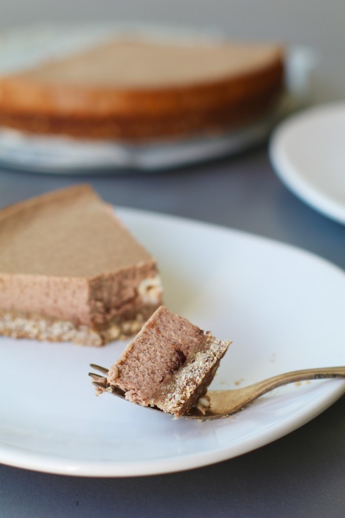 Ik denk oprecht dat ik het goed zou doen als havermout ambassadeur. Ik ontbijt er mee, maak er tussendoortjes van, ik gebruik het in mijn vega burgers of maak er een taartbodem van. Het is gewoon zo makkelijk in gebruik en door de hoeveelheid vezels zit ik er langer vol van dan een ander soort meel. Neem bijvoorbeeld deze Nutella cheesecake. Je kunt ervoor kiezen om de welbekende bodem van koekjes en boter maken, maar je maakt hem simpelweg een stuk voedzamer door een bodem van havermout te maken gezoet met dadels. Een cheesecake zou geen cheesecake zijn zonder roomkaas, maar in plaats van de hoge taarten met acht pakjes monchou die ik vroeger bakte halveerde ik de vulling voor een mooie subtiele cheesecake. Mét Nutella omdat dat echt HEEL erg lekker is.