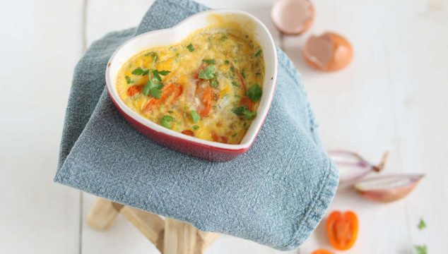 Nu zag ik van die “omelet in een mug” voorbij komen. Een variatie om een muffin uit een mug met behulp van de magnetron. Persoonlijk ben ik niet zo fan van dit apparaat. Je kunt de kooktijd er wel enorm mee verkorten want binnen 2 minuten schijnt zo’n omeletje klaar te zijn. De oven even aanzetten kan ook en na 16 minuten kun je aanvallen. Dit geeft je ondertussen even de tijd om de keuken op te ruimen of een ander klusje te klaren. De omelet uit de oven met tomaat en ui stelde mij niet teleur. Met een grote smile op mijn gezicht heb ik het ovenschaaltje leeg geschraapt.