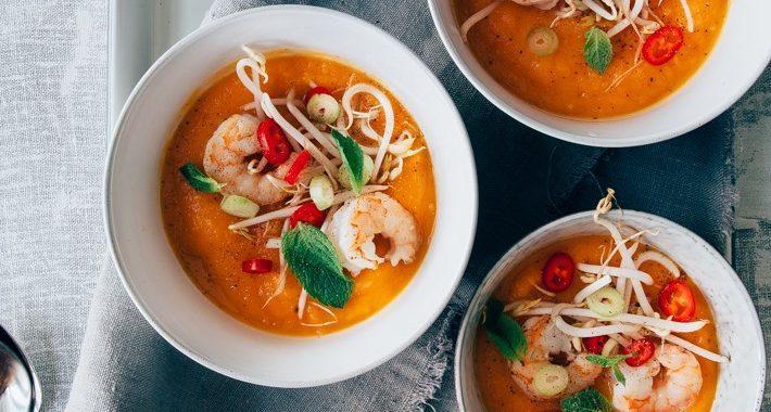 Verder duurt het ongeveer 30 minuten om de soep te maken. Waarvan hij ongeveer 20 minuten staat te pruttelen. Klinkt goed toch? Ik voegde kippenbouillon en garnalen aan de soep toe. Maar wanneer je er een vegetarische soep van wilt maken kan dat ook goed. Je vervangt de bouillon voor groentenbouillon en kiest voor stukjes tofu of pinda’s als topping.