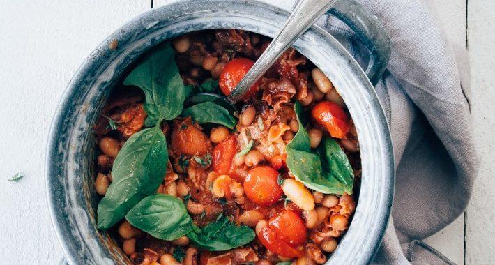 Ingrediënten voor 4 personen 200 gr cannellini bonen uit blik 200 gr black eyed peas, of borlotti bonen uit blik 400 gr tomatenblokjes (of cherrytomaatjes) uit blik 1 ui, fijngehakt 2 teentjes knoflook, fijngehakt 100 gr Parmaham, in reepjes 3 takjes verse tijm 1 handje verse basilicum 2 el olijfolie