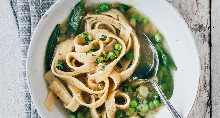 Ingrediënten voor 4 personen 250 gr tagliatelle 150 gr sugarsnaps 100 gr erwten (diepvries) 1 prei 1 ui 1 teen knoflook 4 takjes verse tijm + extra om te garneren 1 (bio)citroen 1,5 ltr kippenhouillon 2 el Olijfolie peper en zout
