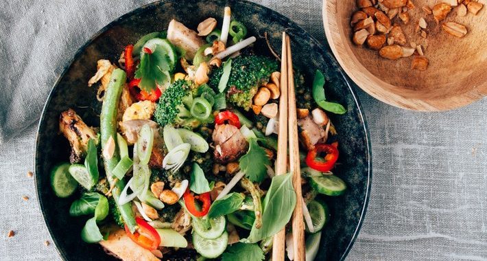 De rest van het recept maak je, zoals het hoort met een wok gerecht, heel snel in een gloeiend hete pan. De kip braad je eerst mooi aan. Wok dan de groenten in de pan en voeg de eieren toe. Die je met een spatel heen en weer door de pan schuift zodat je een soort van scrambled eggs krijgt en tot slot giet je er een zelfgemaakte pindasaus bij. Over de borden verdelen en een flinke lepel Aziatische pesto er bij, wat verse kruiden en genieten maar!