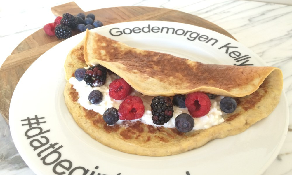 Omdat eieren zoveel eiwit bevatten (duh) zorgen ze voor een verzadigd gevoel, en dat is precies wat je wilt om het tot de lunch vol te houden. Van trek word ik chagrijnig en dat is niet gezellig. Nou geloof me, als je zo'n flinke wrap als deze ophebt, heb je voorlopig geen trek meer! Daarbij is het ontzettend lekker (en zelfs zoet!) en ziet het er ook nog eens prachtig uit. Neem je je ontbijtje liever mee? Rol de omelet dan op zodat je een gerolde wrap hebt. Je kunt trouwens prima in 1 keer 3 omeletten bakken, zodat je ze alleen 's ochtends nog maar hoeft de vullen #tipvankel.