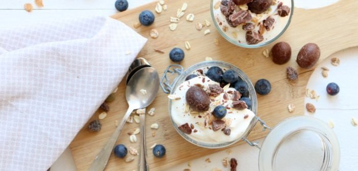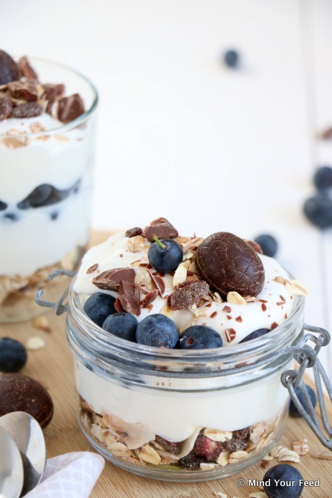 Goedemorgen deze morgen! Het is weer zondag en het belooft een stralend mooie dag te worden! Wat een cadeautje. Voordat je straks naar buiten gaat – ik wel namelijk – heb ik nog een heel makkelijk maar ontzettend lekker verwenontbijtje voor je klaar staan. Een ontbijt tiramisu met muesli, blauwe bessen en chocolade paaseitjes. Alvast een ideetje voor het Paasontbijt?