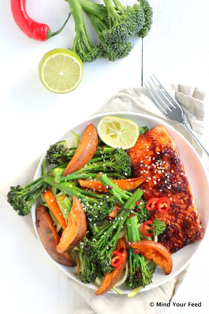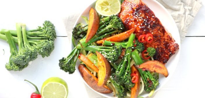 Als je – net als ik – van de Oosterse keuken houdt, dan moet je zeker een keer aan de slag met bimi! Je hebt deze mooie lange stronkjes vast al eens zien liggen tussen de groenten en ik vind ze ideaal voor roerbakgerechten. Bimi is een kruising tussen broccoli en Chinese kool en smaakt mild zoet. Dat gaat perfect samen met de pittige Oosterse zalm die ik vandaag op tafel zet. Daar hou ik van, makkelijke maaltijden boordevol smaak en waar je niet lang voor in de keuken hoeft te staan. Goed idee voor deze fastfood friday?!