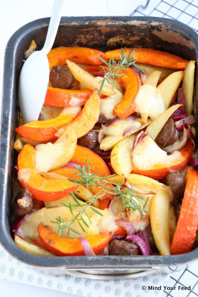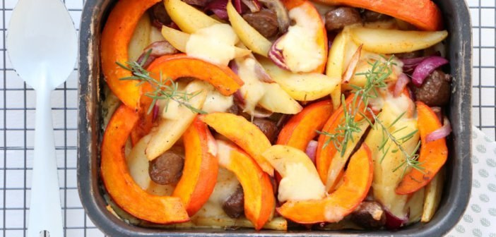 Eigenlijk is deze week pas echt de eerste normale week van dit jaar. Voor ons dan. De eerste week van januari hadden de meiden nog vakantie en deden we nog een beetje half-half alsof we nog niet hoefden te beginnen. Vorige week zat ik in Oostenrijk – daar vertel ik je snel meer over – en dan is deze week ineens een echte week. Een week waarin iedereen weer werkt en naar school gaat. En er dus in de avond een niet al te moeilijke maaltijd op tafel moet komen. Ik hou dan van ovenschotels, want dan kun je zelf nog even wat anders gaan doen. Zoals deze ovenschotel met pompoen, aardappel en worst die ik hier afgelopen week klaar maakte.