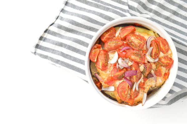 Aubergine met kip, tomaten en pesto-yoghurtsaus uit de oven 13 augustus 2017