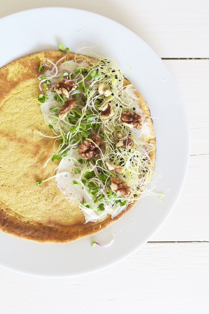 Afgelopen week probeerde ik wat pannenkoek recepten met groenten erin en deze pannenkoekjes van pompoen met roomkaas en kiemen waren de absolute winnaar! Ik at ze deze week al drie keer zó lekker vind ik ze. Een beetje roomkaas erop, kiemen erbij, wat walnoten en oprollen maar. Snel, gezond en heerlijk! Het recept is voor drie stuks zodat je over hebt om mee te nemen als tussendoortje. Of neem er een als ontbijt en besmeer hem met een laagje choco pasta en walnoten.