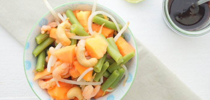 De papaja wordt veel in Zuid Amerika en in Azië gebruikt, vooral in de Thaise keuken is deze vrucht erg populair. Ik wilde dan ook eens ervaren hoe deze vrucht smaakt in een oosterse salade. De papaja is zoet, bevat veel bètacaroteen (voorloper van vitamine A) en is ook rijk aan vitamine C. Maar wat de papaja écht heel bijzonder maakt, is dat het de stof papaïne bevat. Dit is een eiwitsplitser, die ervoor zorgt dat de eiwitten in je voeding makkelijker verteerbaar zijn.