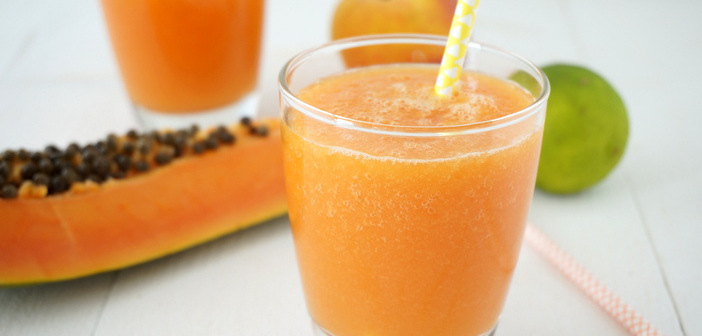 Moet je nou eens zien wat een prachtige kleur deze smoothie heeft! Echt, daar word ik alvast heel vrolijk van! Sowieso vind ik het heerlijk om met zomerfruit te werken, de smoothie krijgt er zulke prachtige kleuren van. Ik ging voor deze smoothie aan de slag met de papaya, want daar had ik er een aantal vangekregen! De papaya is zoet, bevat veel bètacaroteen (voorloper van vitamine A) en is ook rijk aan vitamine C. Maar wat de papaya écht heel bijzonder maakt, is dat het de stof papaïne bevat. Dit is een eiwitsplitser, die ervoor zorgt dat de eiwitten in je voeding makkelijker verteerbaar zijn. Altijd fijn toch!