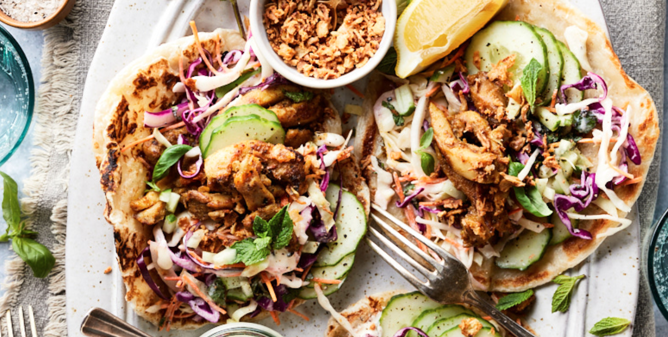 Paratha met kip: dit is zo’n gerecht waar je meteen vrolijk van wordt. Knapperige coleslaw, geurige kip met Thaise Groene Currypasta, frisse kruiden én alles geserveerd op een warme paratha. Een paratha is een soort Indiase flatbread, lekker krokant van buiten en zacht van binnen. Kun je het niet vinden in de supermarkt of toko? Dan kun je het ook prima vervangen door naan.