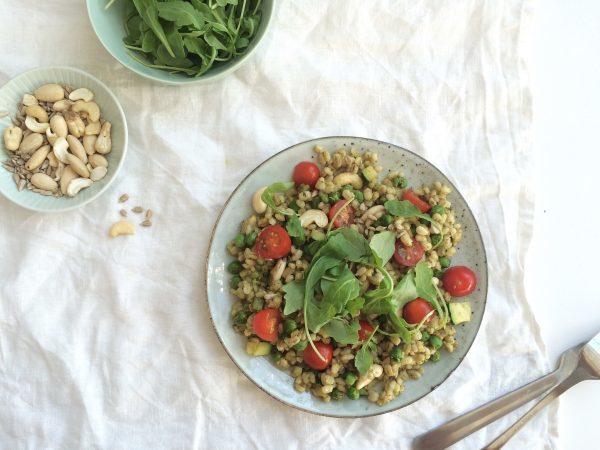 Dit gerecht van parelgort met pesto heeft een beetje een romige textuur, maar is een stuk lichter dan risotto. Je kunt dit gerecht warm eten, maar is koud ook heerlijk als salade voor lunch of op een zomerse avond.