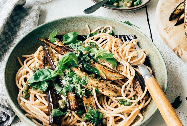 Het is een heerlijk vega recept en nog lekker snel gemaakt ook. Je hebt alleen wat geduld nodig met de aubergines. De aubergine snijd je eerst in dikke plakken en dan opnieuw in mooie repen. Daarna bak je ze, samen met die gedroogde oregano, in een pan met wat olijfolie. Heel lekker als je het mij vraagt. Maar net als met alles wat je in een pan bakt, ze worden niet bruin wanneer je ze op elkaar stapelt. Kortom je moet de repen wat ruimte geven. Er kan dus maar een enkele laag in de koekenpan en daarom ben je er wel eventjes mee bezig. Geeft niets de rest, een kruiden dressing van verse kruiden en kappertjes, heb je dan weer zo in elkaar gedraaid. Het geeft een lekker zurige smaak aan het gerecht en samen met wat snippers parmezaanse kaas voeg je ook nog iets romigs toe. Een perfect gerecht voor doordeweeks. Overigens ben ik zelf de Parmezaanse kaas snippers op de foto’s vergeten, maar je kunt je er vast iets bij voorstellen!