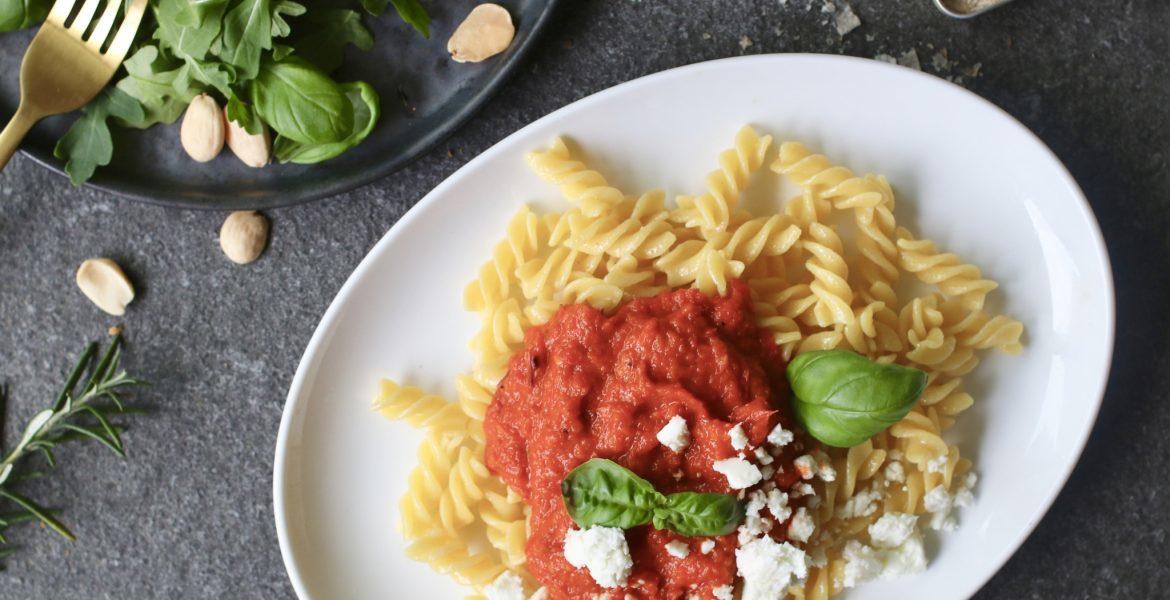 Oelalaaa wat een lekkere saus is dit! Ik bedacht hem spontaan toen ik geen zin had om naar de supermarkt te gaan. Ik ben helaas niet het type met een wekelijks georganiseerd boodschappenlijstje ;) Ik besloot een simpele en gezonde pastasaus te maken van puntpaprika’s en wat bospenen. Rooster deze groenten samen met een sjalot en hele knoflooktenen in de oven en je hebt een goddelijke én voedzame saus die ook nog eens super makkelijk te maken is. Serveer en een groene salade bij van rucola, amandelen, kruidenolie en eet smakelijk!