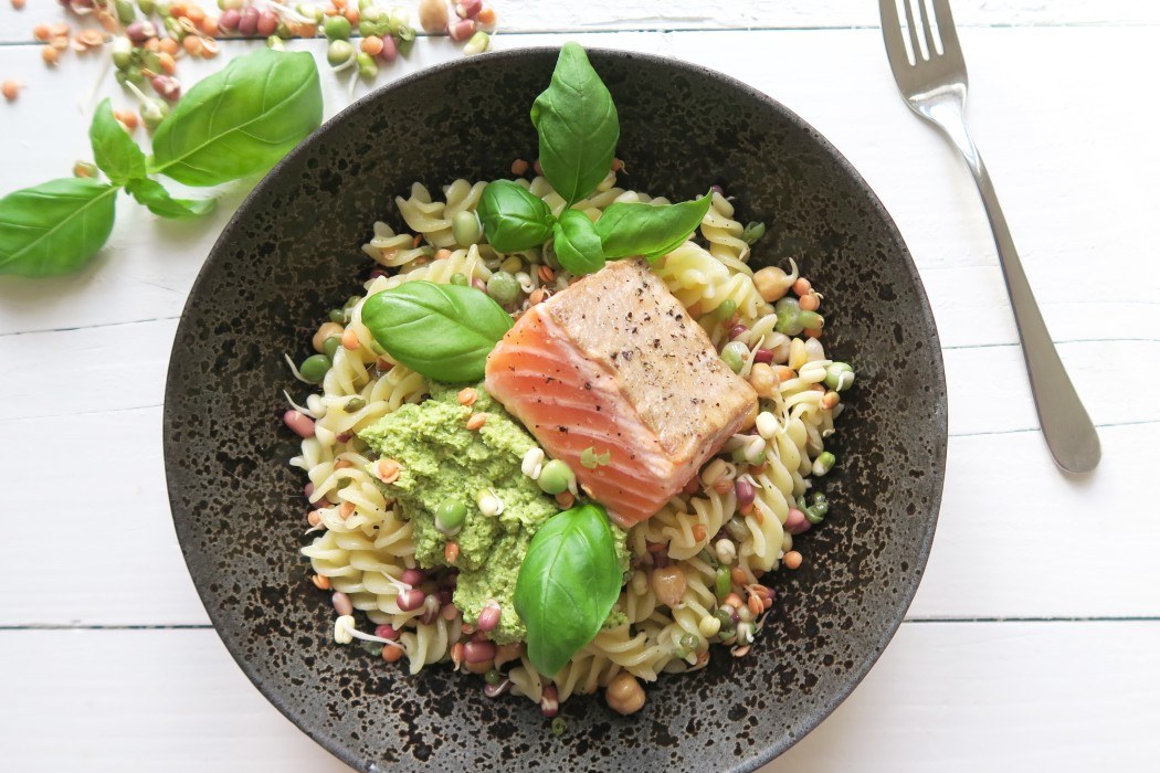 Jaaaa zon daar ben je, wat heerlijk! Ik deed vanmorgen voor het eerst dit jaar de koepel naar mijn dakterras open en wat een heerlijkheid hierboven zeg. Jammer dat mijn wifi het niet doet, maar lang leve de hotspot op mijn telefoon. Kussentjes op de bank, foodpost als ontbijt (overnight oats van Van Haver Tot), kistje als bureau, macbook, to do lijst en go go go :) Op de planning staat dit goddelijke recept van pasta met zalm met een pesto van doperwten. En kiemen!