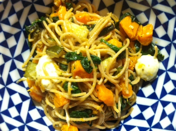 Pompoen, ik kan er maar geen genoeg van krijgen! Eigenlijk ben ik een ontzettend zomermens, maar mijn oranje gekleurde vriend maakt die herfstmaanden stiekem toch best aangenaam. Deze week een heel simpel pasta gerechtje met pompoen, courgette en spinazie.