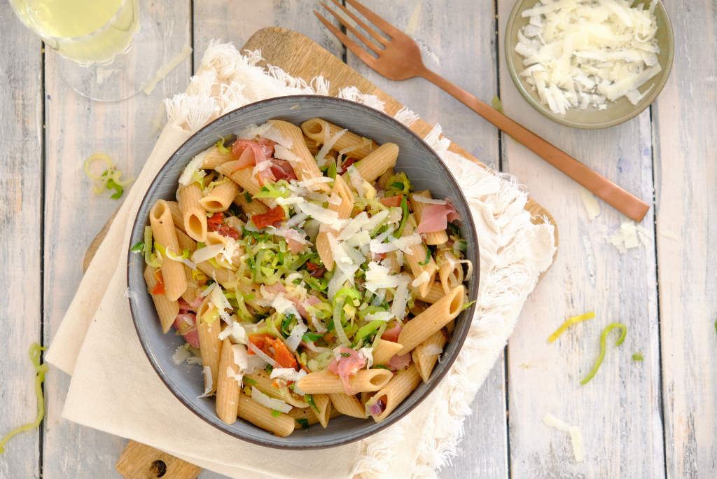 Pasta met prei en ham