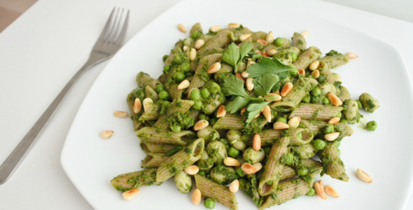 Oké, over naar het receptje. Deze pasta met tuinbonen en muntpesto is door de munt heerlijk fris van smaak en de pijnboompitjes zorgen voor een lekkere bite. De tuinbonen zijn een goede bron van vezels en kalium, wat een positieve invloed heeft op je bloeddruk. Zorg dat je altijd voor volkoren pasta kiest in plaats van niet-volkoren. Hier zitten veel meer vezels in! De zelfgemaakte pesto is echt heerlijk. Als je geen zin of tijd hebt om de pesto zelf te maken, kun je ook een kant en klare pesto gebruiken. Zorg er dan wel voor dat deze vrij van e-nummers en andere onnodige toevoegingen is. Of gebruik dit recept als je fan bent van pesto met Parmezaanse kaas. Ook lekker, waar zouden we toch zijn zonder pesto?