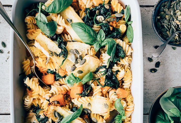 Die pompoenpitten kun je of kopen of heel nowaste uit je eigen pompoen halen. Het is dan wel even een klein klusje om al die pompoenvezels van de pitten af te wassen. Rooster ze even kort in een droge koekenpan voor extra lekkere smaak. Wanneer je niet zo’n fan bent van pompoenpitten dan kun je ze vervangen voor walnoten of pijnboompitten. Dat is beiden heel wat anders, maar wel heel lekker in deze pasta ovenschotel.