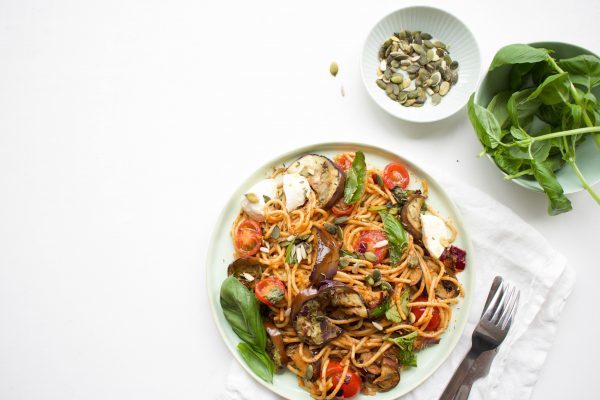 Deze pasta rode pesto met gegrilde aubergine en basilicum is zo een heerlijke, best simpele pasta. Makkelijk en snel gemaakt en heerlijk op zonnige dagen. Glas wijn er bij en genieten maar.