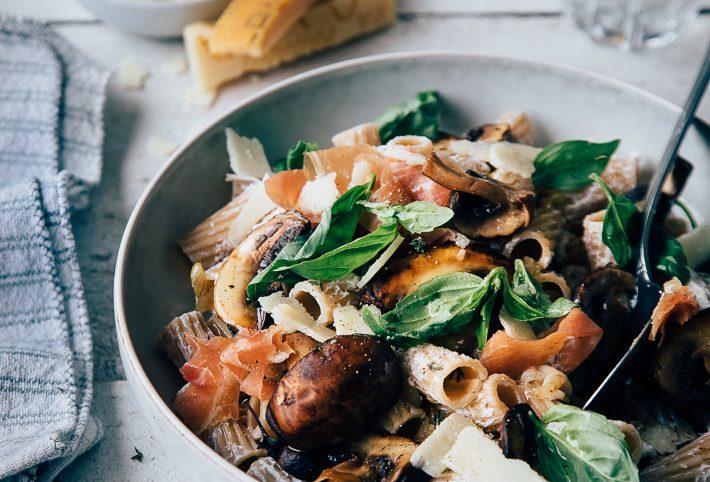 En van riccottasaus daar worden we natuurlijk met zijn allen ook niet slanker van. Ik stel voor dat we na dit recept gewoon een paar keer de trap op en neer lopen en morgen (wanneer mogelijk) op de fiets naar het werk gaan (of anders daar de trap nemen in plaats van de lift). Maar er zitten wel lekker veel paddestoelen in en je hebt het ook in een handomdraai gemaakt, maximaal 20 minuten! Dat is dan weer wel mooi meegenomen. De saus maak je door ricotta met parmezaanse kaas te mengen en dan op smaak te brengen met wat peper en zout. Wanneer je de saus met nog wat kookvocht door de pasta mengt warmt het automatisch op en mengt het zich perfect door de pasta.