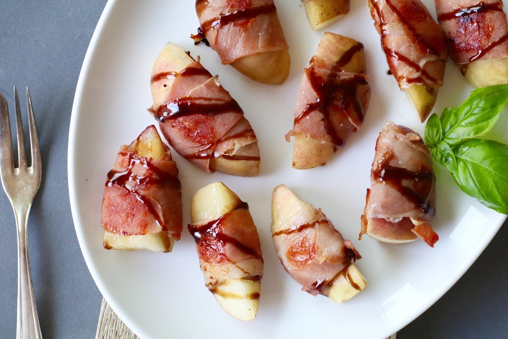 Ik probeer in mijn recepten altijd een mooie balans tussen zoet, zuur en zout te vinden en dat is bij dit recept heeeel goed gelukt. Al zeg ik het zelf. En zo simpel ook! Je haalt wat verse perziken, het liefst wild want die zijn lekker zoet, en je omwikkeld ze met serranoham. Even op de grill met wat balsamicostroop en je hebt binnen no time een mega lekker hapje gemaakt. Warm zijn ze super lekker, maar het fijne is dat ze nét zo lekker smaken als ze afgekoeld zijn. Wel zo handig op een borrel, feestje of verjaardag.