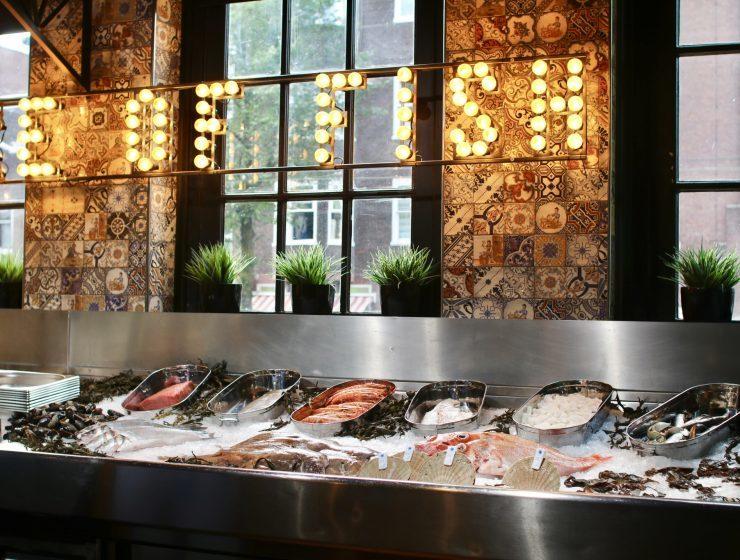 Nu zie je jezelf misschien niet zo snel in een leuk jurkje al etend aan een tafeltje op een vismarkt zitten, maar geloof mij dat dit zeker niet het geval is. Pesca is een echt restaurant maar dan met de kenmerken van een ouderwetse vismarkt. Eigenlijk gaan we op een classy manier back to basic. Bij binnenkomst kies je met een bubbeltje in de hand samen je favoriete vissoorten uit. Geen idee waar je zin in hebt? Laat je dan gewoon verrassen. Het personeel bij de viskraam legt je met alle liefde alles uit over het aanbod. Wij sprokkelden wat coquilles bij elkaar, een stuk verse kakelverse tonijn, gamba’s en een zeebaars. Vervolgens kies je je bereidingswijze en hobbel je door naar de wijnmarkt voor een lekkere fles wijn!