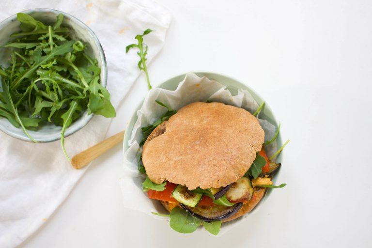 Pitabroodjes met humus, gegrilde groenten en rucola. Een heerlijke, voedzame en plantaardige lunch. Én je hebt meteen al een portie groenten binnen.